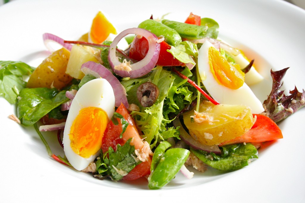 Du trenger grønn salat av ulike slag, tomater, rødløk, kokt potet i terninger, tunfisk i olje, svart oliven, hardkokte egg skåret i båter, ansjos og sukkererter eller grønne bønner. Dressing: Olivenolje, hvitvinseddik, dijonsennep, salt og pepper. Gni innsiden av salatbollen med en kløyvd hvitløksbåt, så får du et behagelig streif av hvitløk.