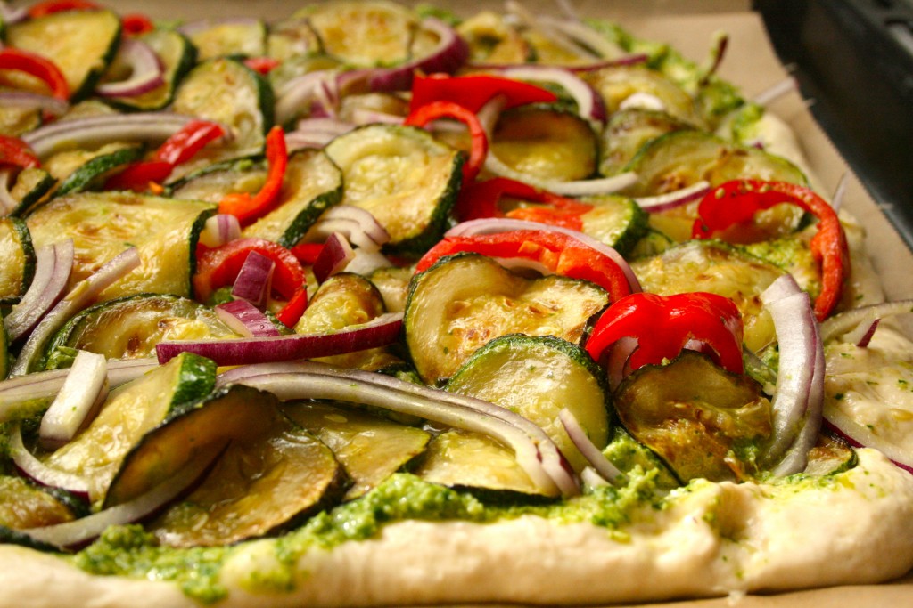 Hvelv deigen ut på et stekebrett kledd med bakepapir. Hell en god dæsj olje på deigen og smør hendene dine med litt olje også. Så glatter du deigen utover til du har en flat pizzalignende sak foran deg. Smør pestoen tykt og godt utover, og plasser så grønnsakene rundt omkring. De skal ligge tett! Når alle er på plass dytter du dem litt ned i deigen med fingrene. Salte og pepre.Stek nederst i ovnen på 210-220 grader i 20 minutter. Men hold et øye med den! Hvem vet: kanskje har du en ovn som går på atomkraft, og så ender du opp med karbonkake etter 10 minutter…