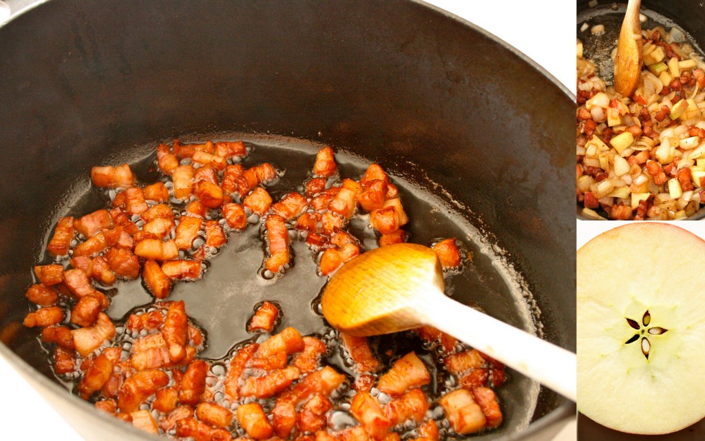 Stek baconet i en svær panne eller jerngryte til de sprø og gyldenbrune. Ta dem ut av panna og la fettet være igjen, som du så steker løken i til den er gyldenbrun også. Så har du baconet tilbake i gryta sammen med eplebitene, og lar det hele få kose og parre seg et par minutter.