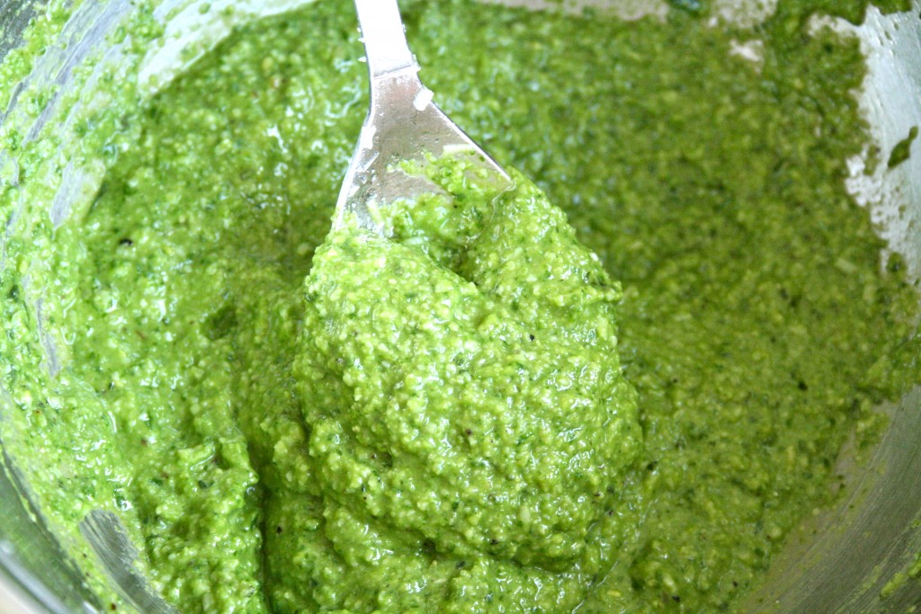 Ha alle ingredienser i en bolle, og gi dem en omgang med stavmikser til det hele er most. Du kan også bruke morter eller kjøkkenmaskin med kniv.