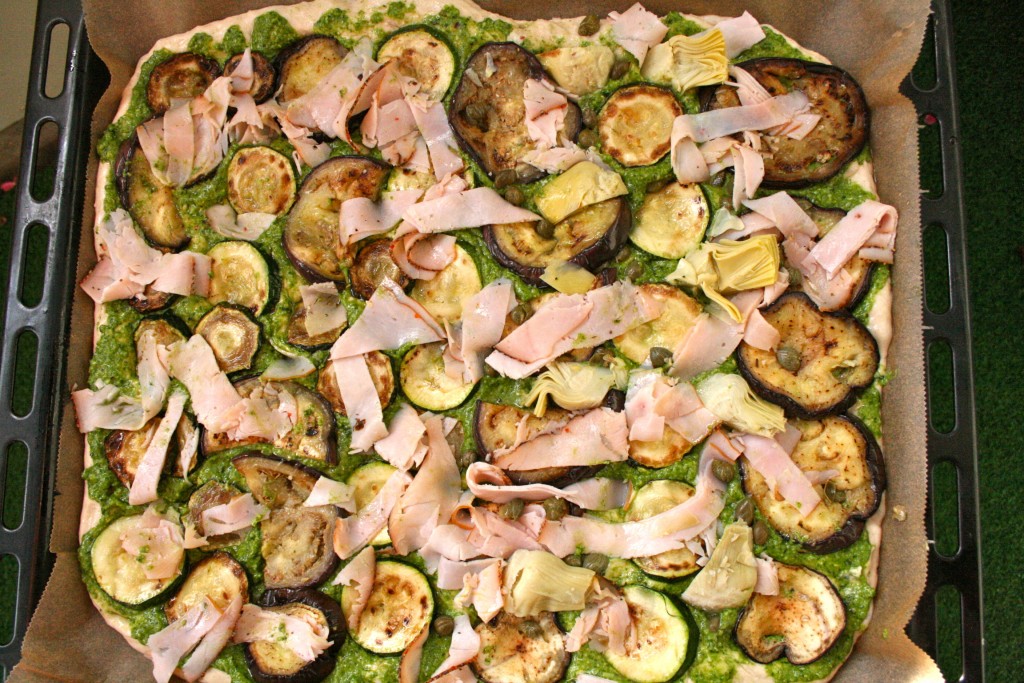 Smør hele deigen raust med pesto. Legg på de andre ingrediensene slik du ønsker (det skal være tett mellom godbitene!), og press dem litt ned i deigen med fingrene.