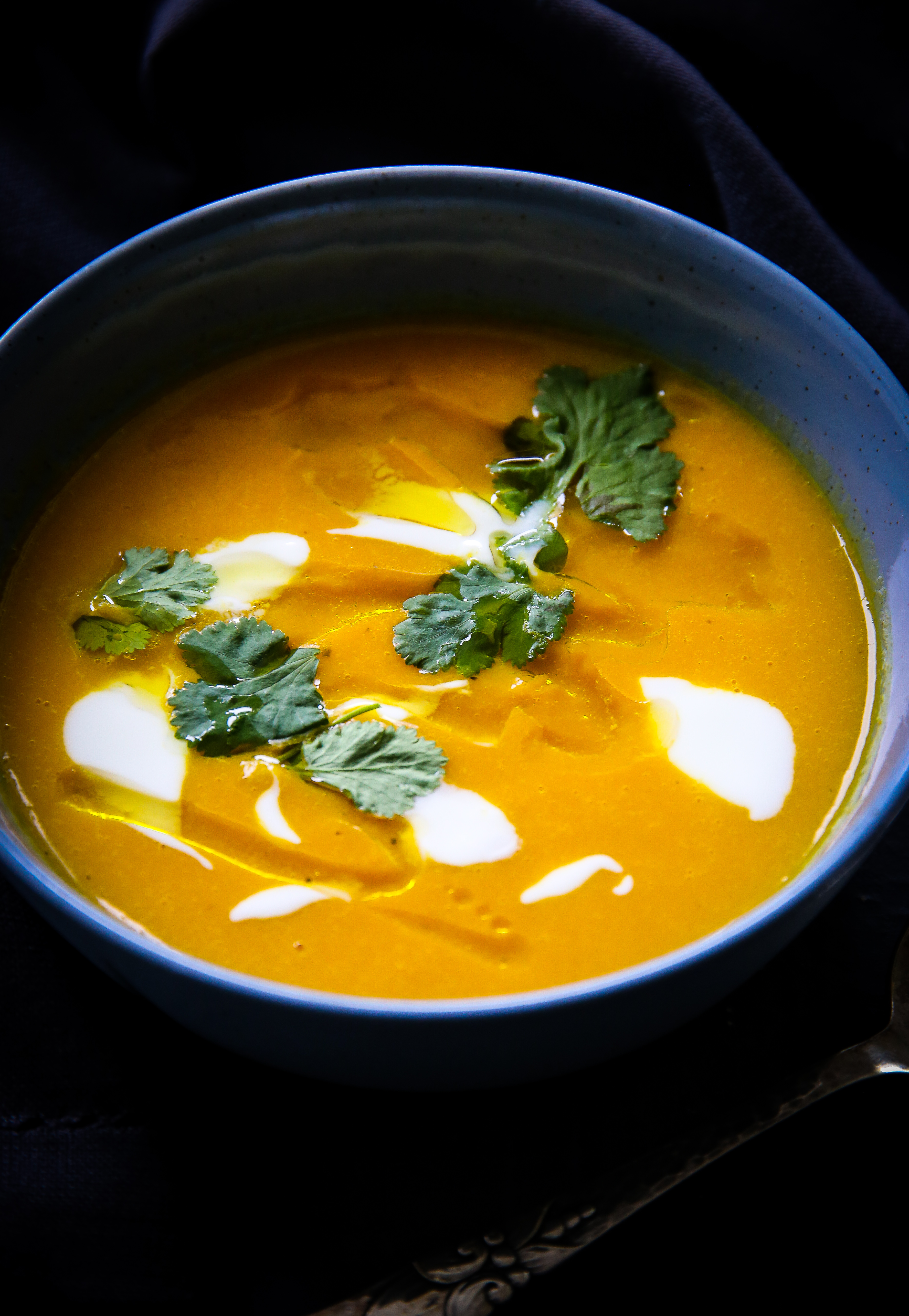 Purér med stavmikser eller i blender. Hvis suppa er for tjukk i konsistensen tilsetter du bare mer kraft/buljong til du har en konsistens du selv synes er god i munnen. Smak til med salt og pepper. Pynt med litt mer yoghurt, et par runder god olivenolje og frisk koriander.