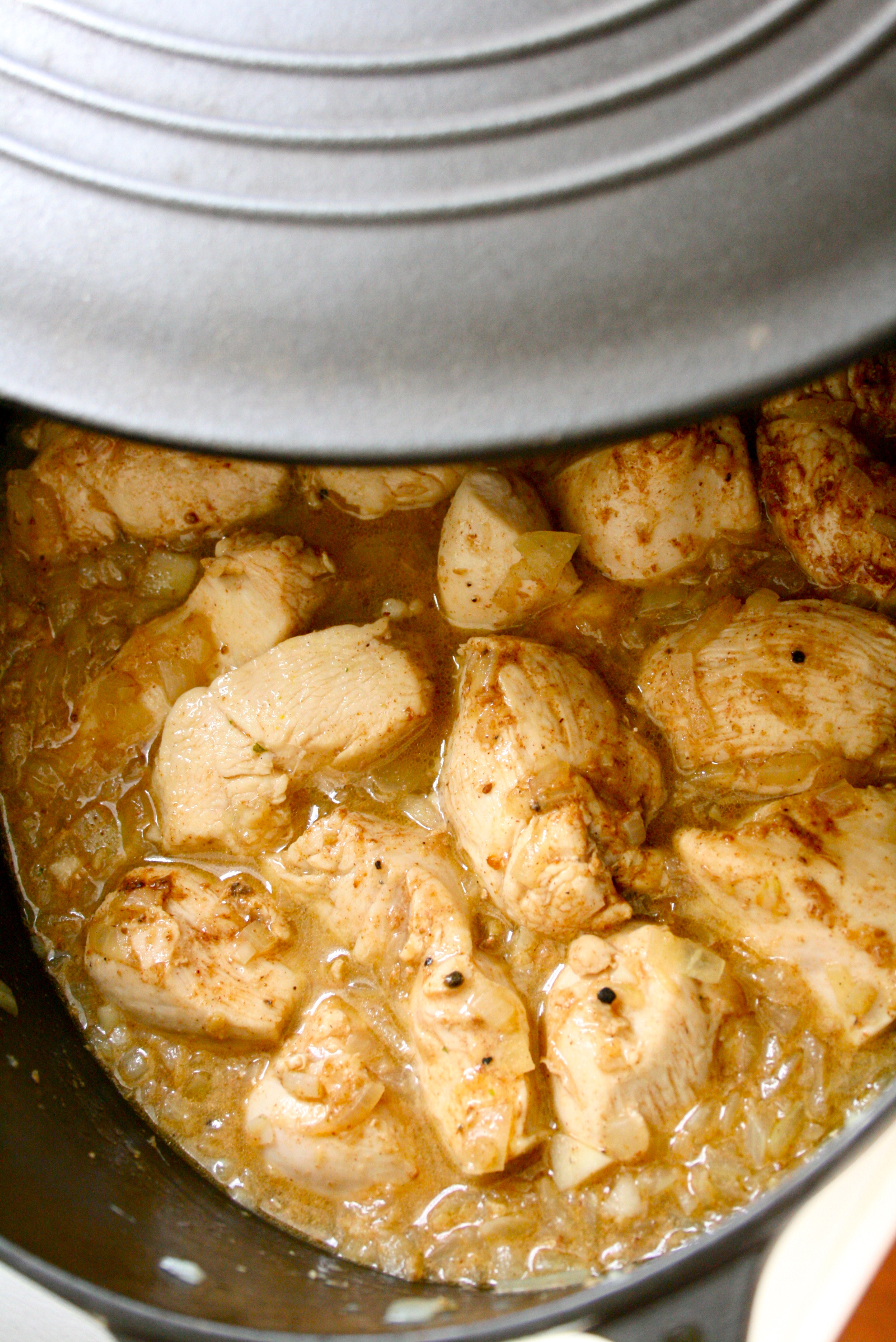 Men altså: I en tykkbunnet gryte steker du løken til den er myk og gylden. Så tilsetter du kylling, ingefær og hvitløk og lar det surre til kyllingen er stekt på alle sider. Tar 3-4 minutter, tenker jeg. Salte og pepre.