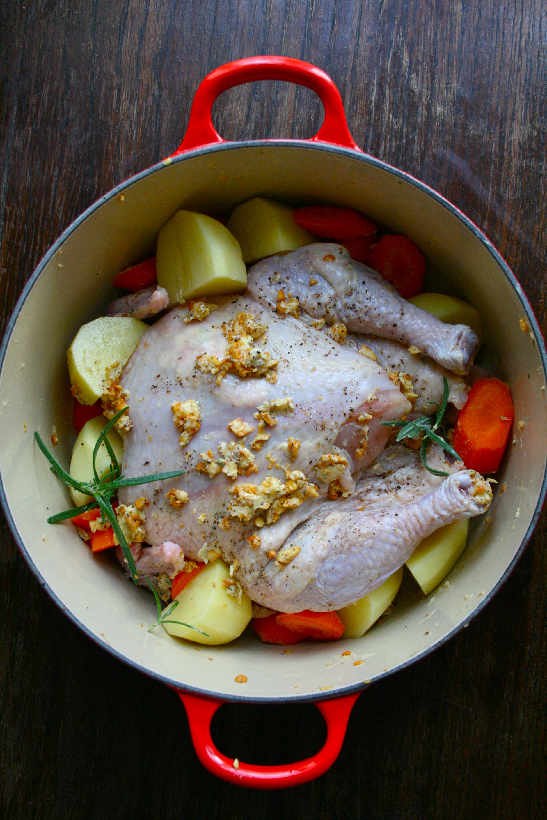 Legg kyllingen oppå poteter og gulrøtter, sett på et lokk og stek i ovnen på 180 grader til steketermometeret viser 68 grader (hvis du ikke bruker termometer vil jeg si ca 1 time til halvannen i ovnen), og la den hvile minst 10 minutter før du skjærer i den.