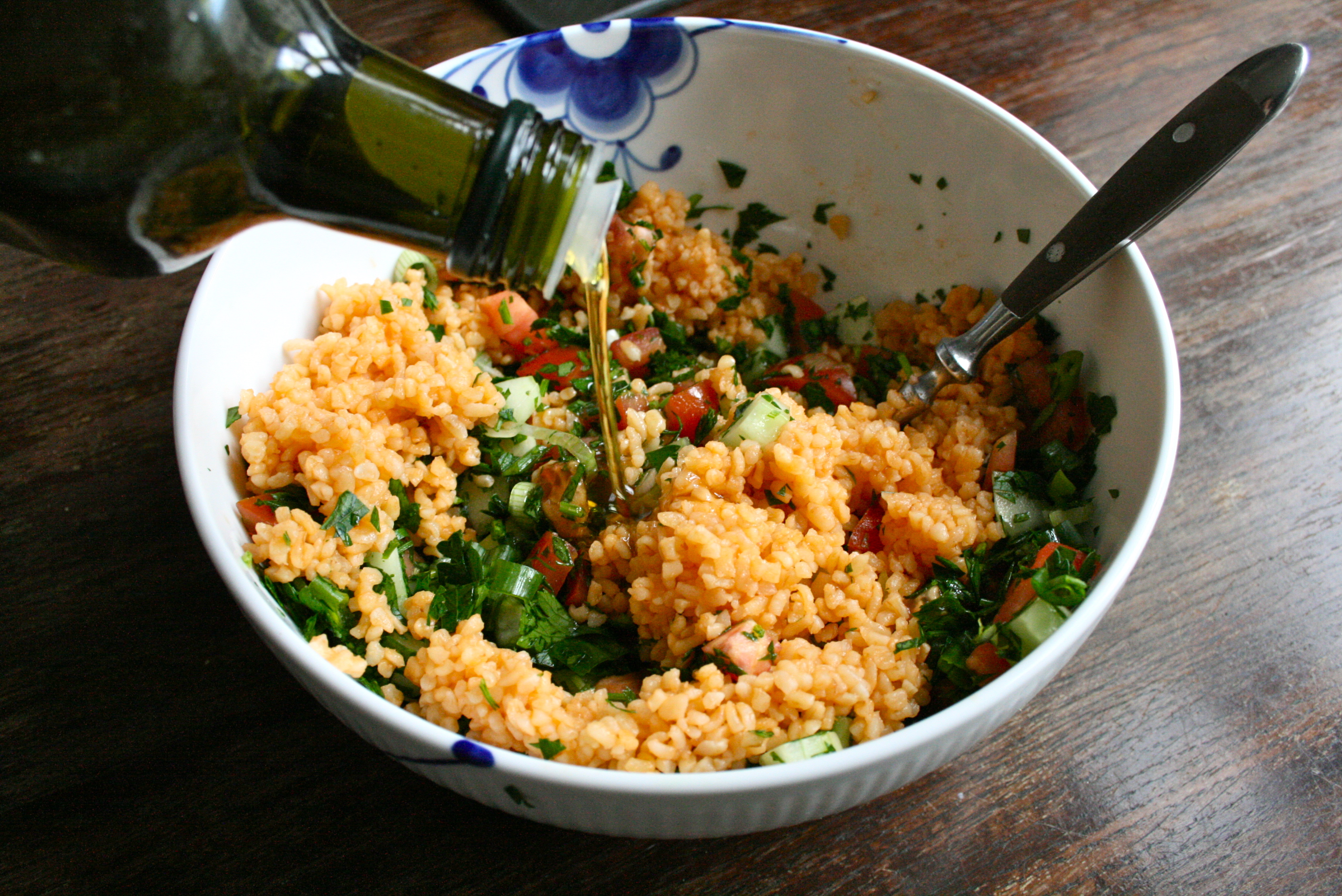 Lag aller først bulguren sånn at den får tid til å bli kald før den skal blandes i salaten. Bare følg henvisningen på pakken du kjøper. For å gi ekstra god smak, pleier jeg å tilsette 1 ts tomatpuré og 1 ss smør mens det koker. Prøv! Godt!