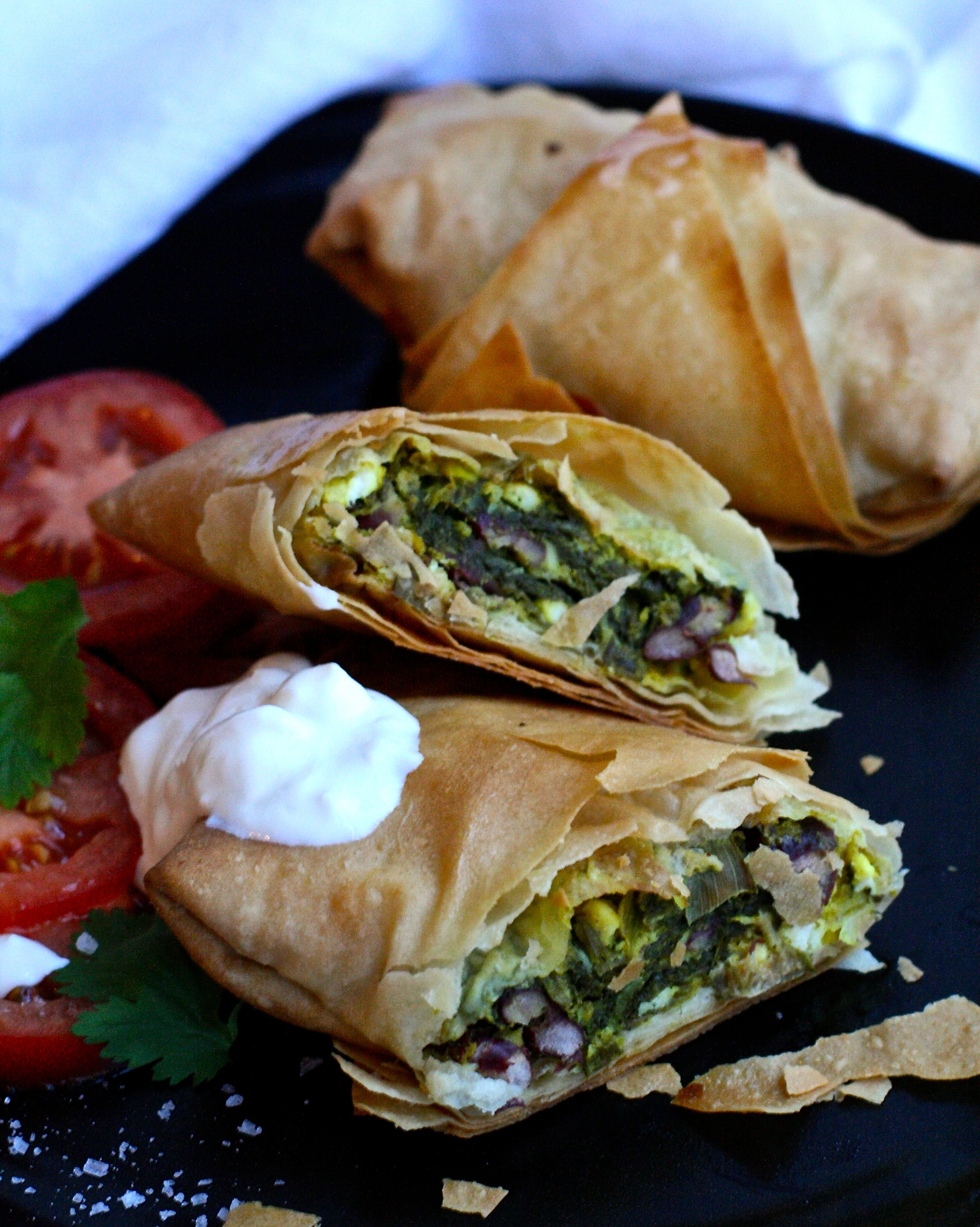 La meg si det med en gang: Du trenger ikke bruke filodeig her. Du kan bruke butterdeig. Da får du en slags samosa som ikke er så knasende sprø, men minst like god. Fyllet spiller uansett hovedrollen, og det er digg!
