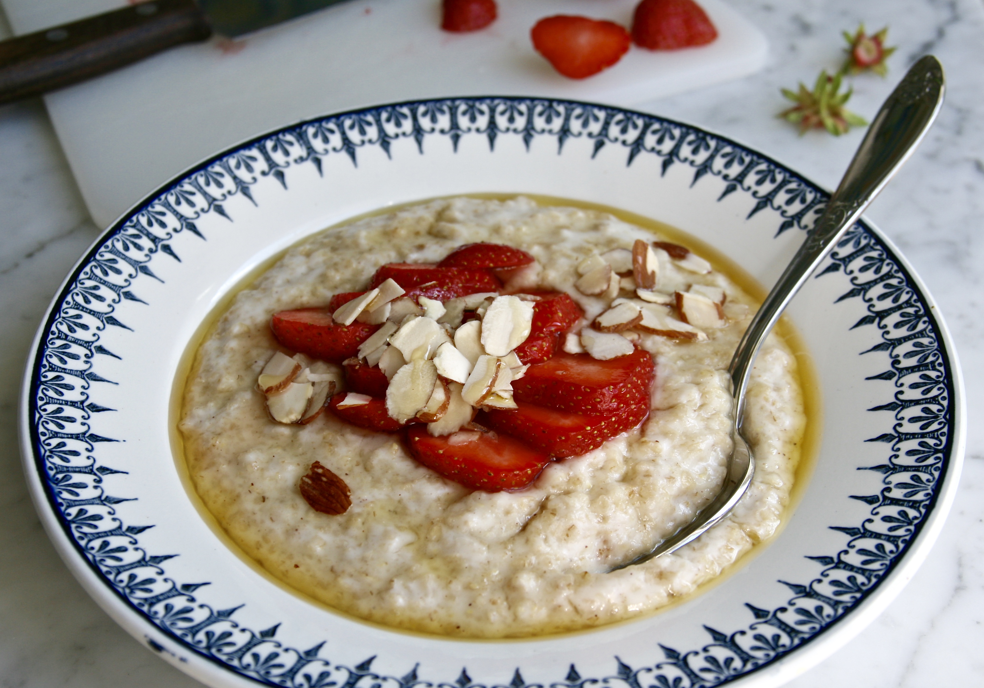Vanligvis bruker jeg like deler vann og melk når jeg koker havregrøten min til frokost. Jeg synes melk gir en deilig kremet smak og konsistens som løfter grøten opp fra strieskjorte-segmentet. Jeg er forøvrig så glad i havregrøt at jeg gjerne spiser det til middag også, når ingen andre ser på. Som regel topper jeg den med noen runder honning og masse hakkede valnøtter. Og når jeg ikke har noen samvittighet igjen for noe som helst, så topper jeg grøten med en real klunk kremfløte. Dét er godt! En slags dessert, i grunnen, hvis du også har på noen friske bær.