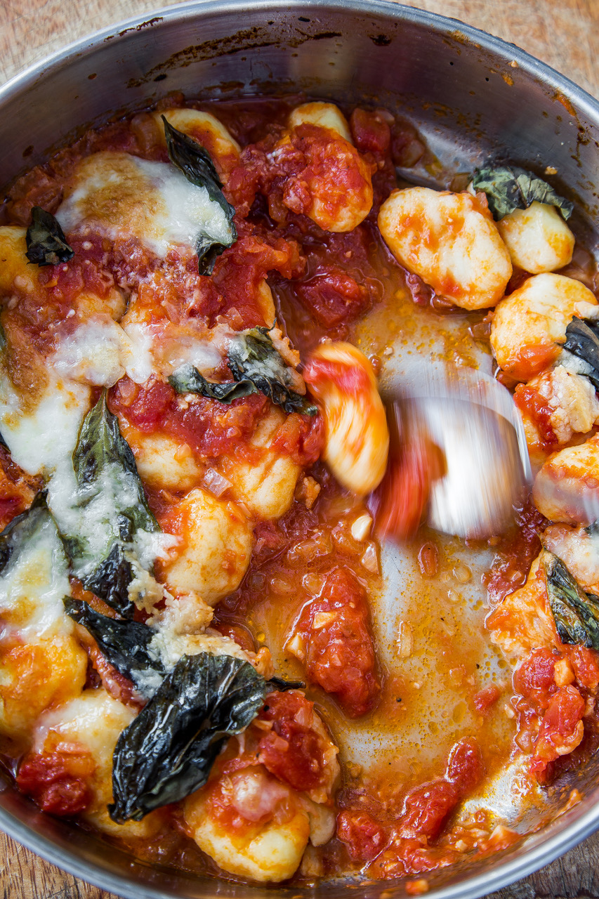Kok opp en stor kjele med saltet vann. Når det fosskoker, har du gnocchiene oppi vannet i omganger. De er ferdigkokte når de flyter til overflaten etter 2-3 minutter. Ta dem ut med en hullsleiv og legg dem i tomatsausen. Rør inn grovhakket basilikum og hell både saus og gnocchi over i en ildfast form.