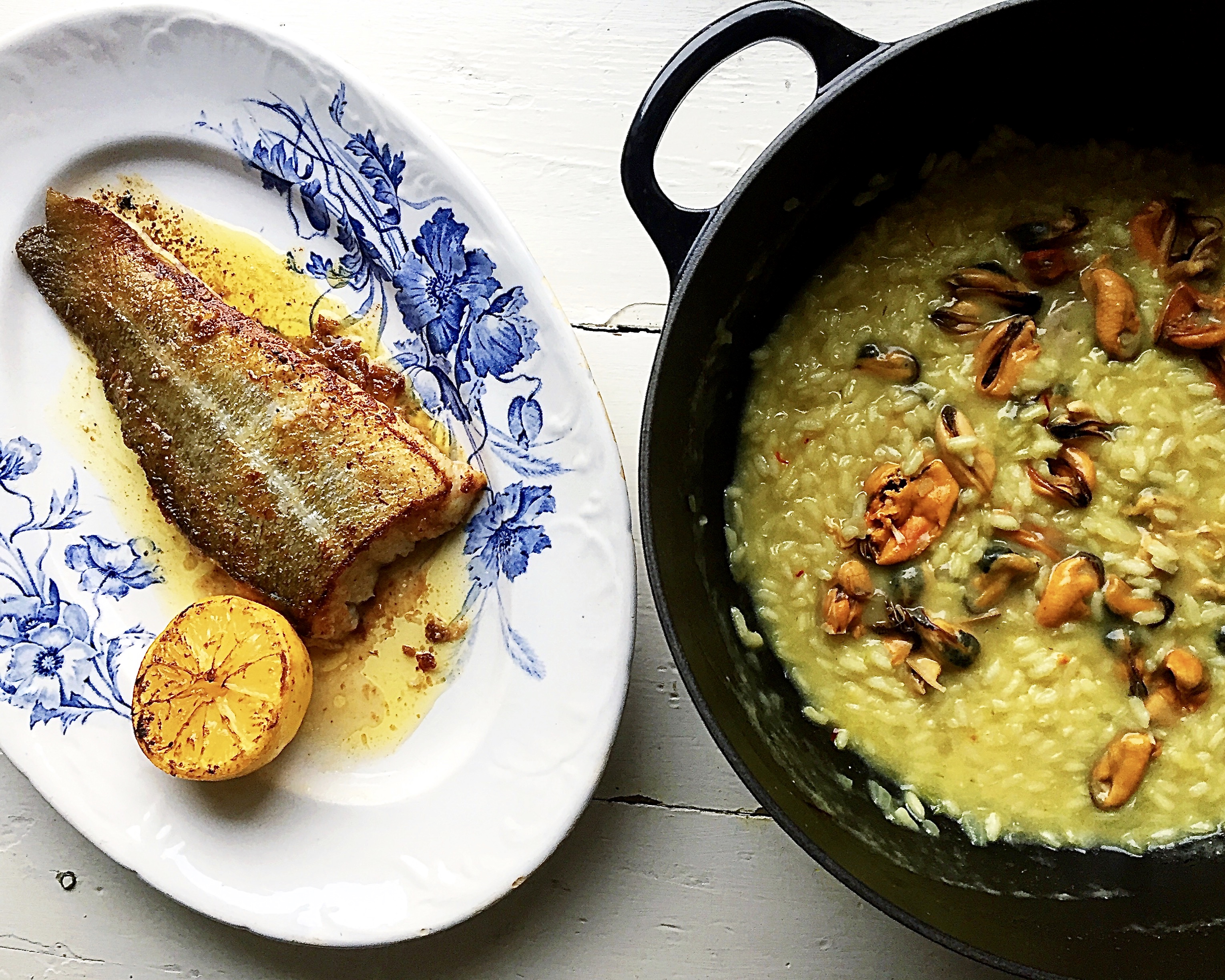 Ved siden av denne runden med risotto hadde jeg bare et stykke smørstekt torsk med en grilla/stekt halv sitron til å skvise over. Og en enkel grønn salat. Mer trenger ikke jeg på en lørdag om våren for å være lykkelig.