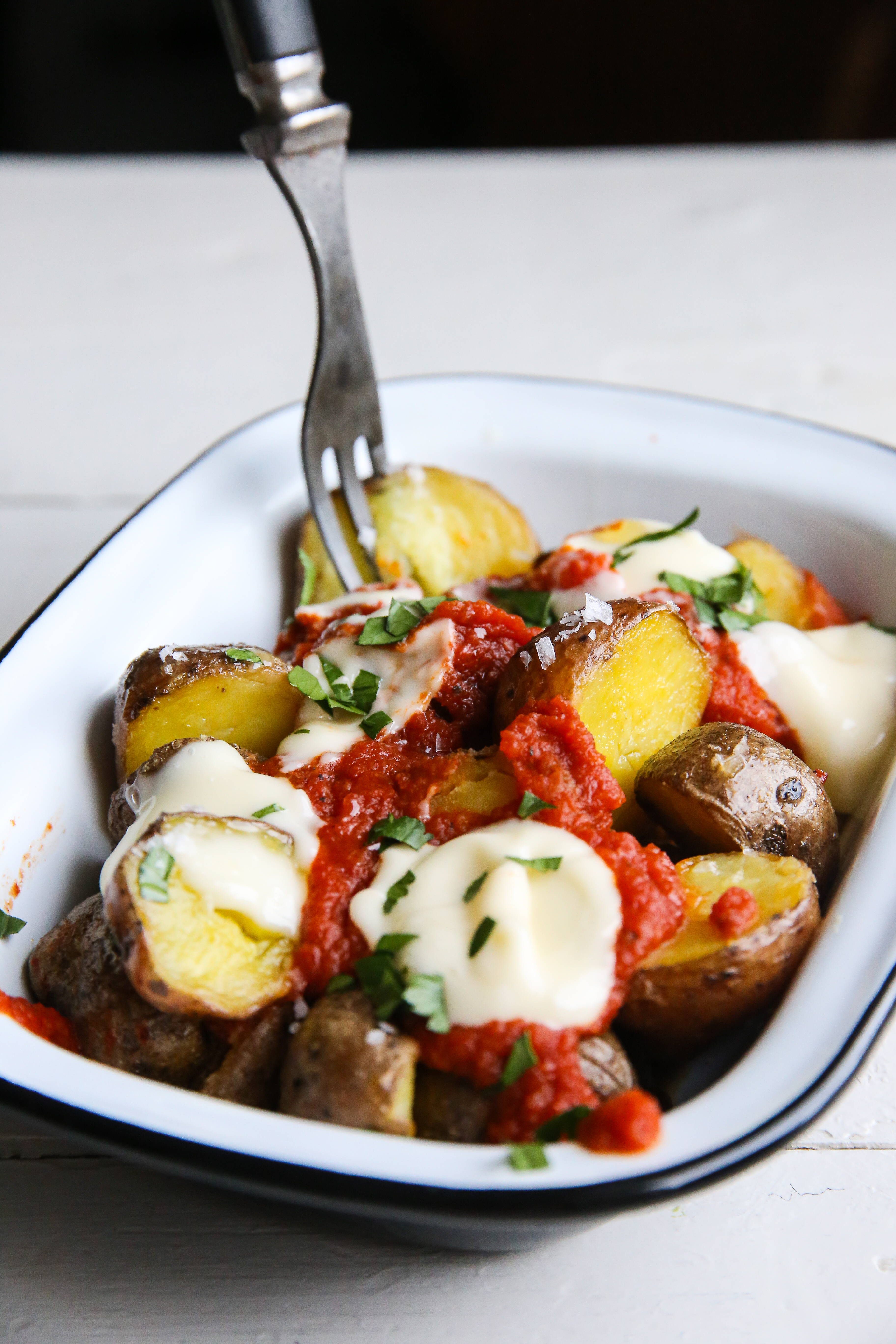Mos tomat, løk, hvitløk, røkt paprika, cayenne/chili, sukker, salt og pepper med stavmikser, eller i en blender. Hell det i en gryte med litt olivenolje og kok opp. La sausen koke ca 20 minutter under lokk, så den rå smaken rundes av. Smak til og juster med sukker, salt og pepper helt til slutt også. La det stå og putre på plata mens du tilbereder potetene.