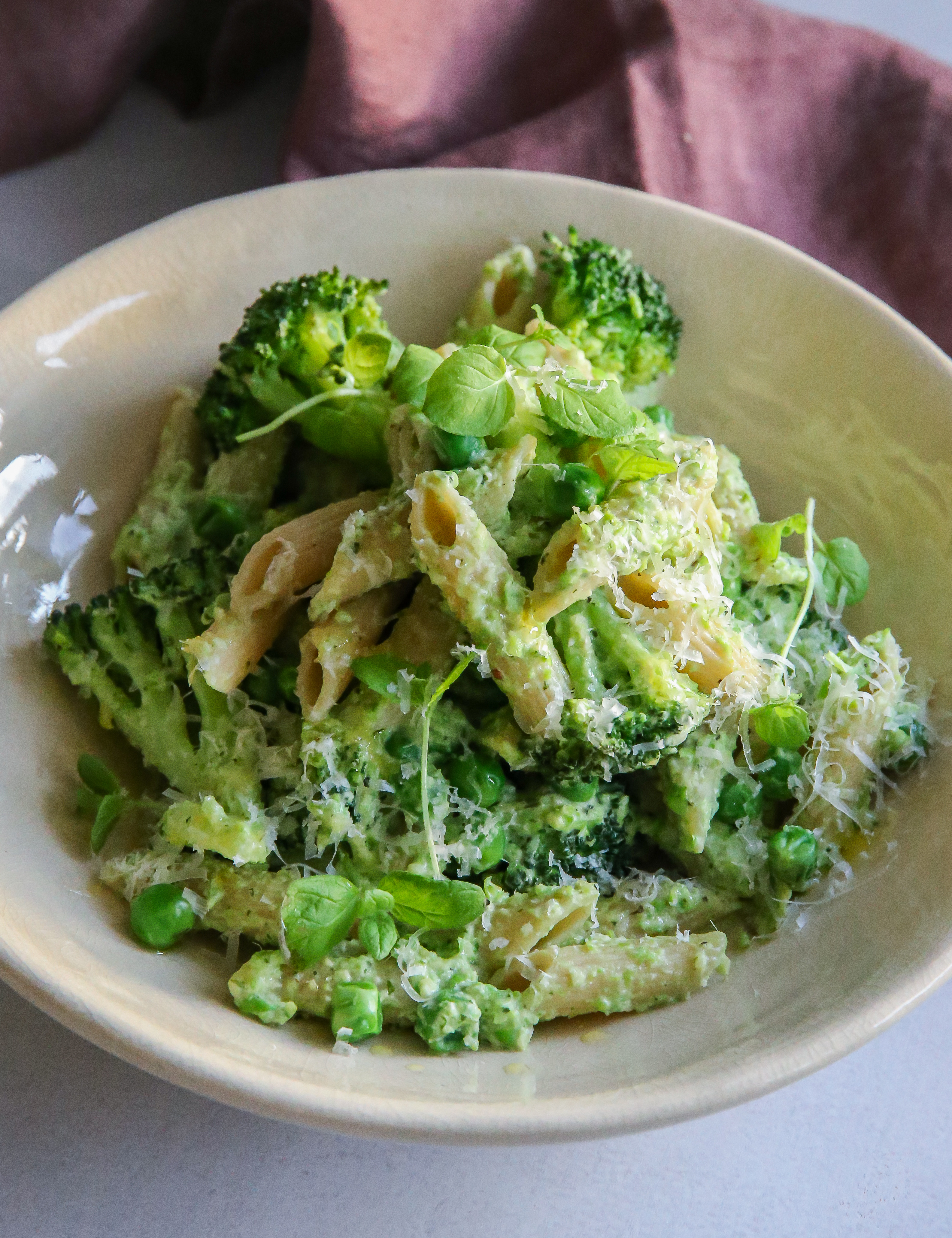 Når pastane har to minutter igjen å koke, har du brokkolibuketter i gryta og lar dem koke med de siste minuttene. Hell av vannet og bland straks inn pestoen med både pasta, brokkoli og siste halvdel av ertene.