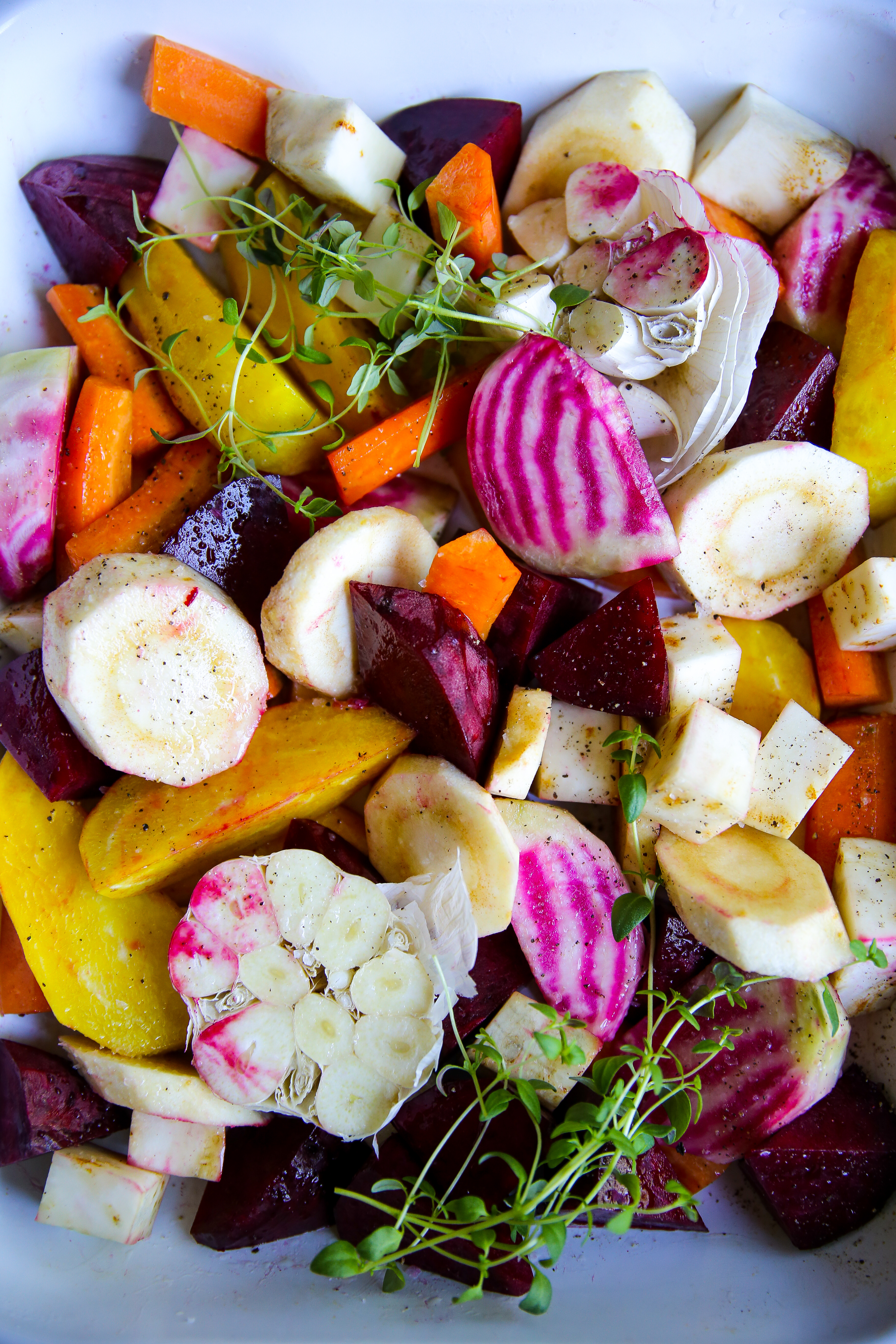 Sellerirot, persillerot og pastinakk smaker knallgodt, men gir kanskje ikke det mest spennende visuelle spillet i panna, så litt hjelp fra chioggia/polkabete, gulbete og rødbete er lurt. De ser ut som en million og smaker også sånn.