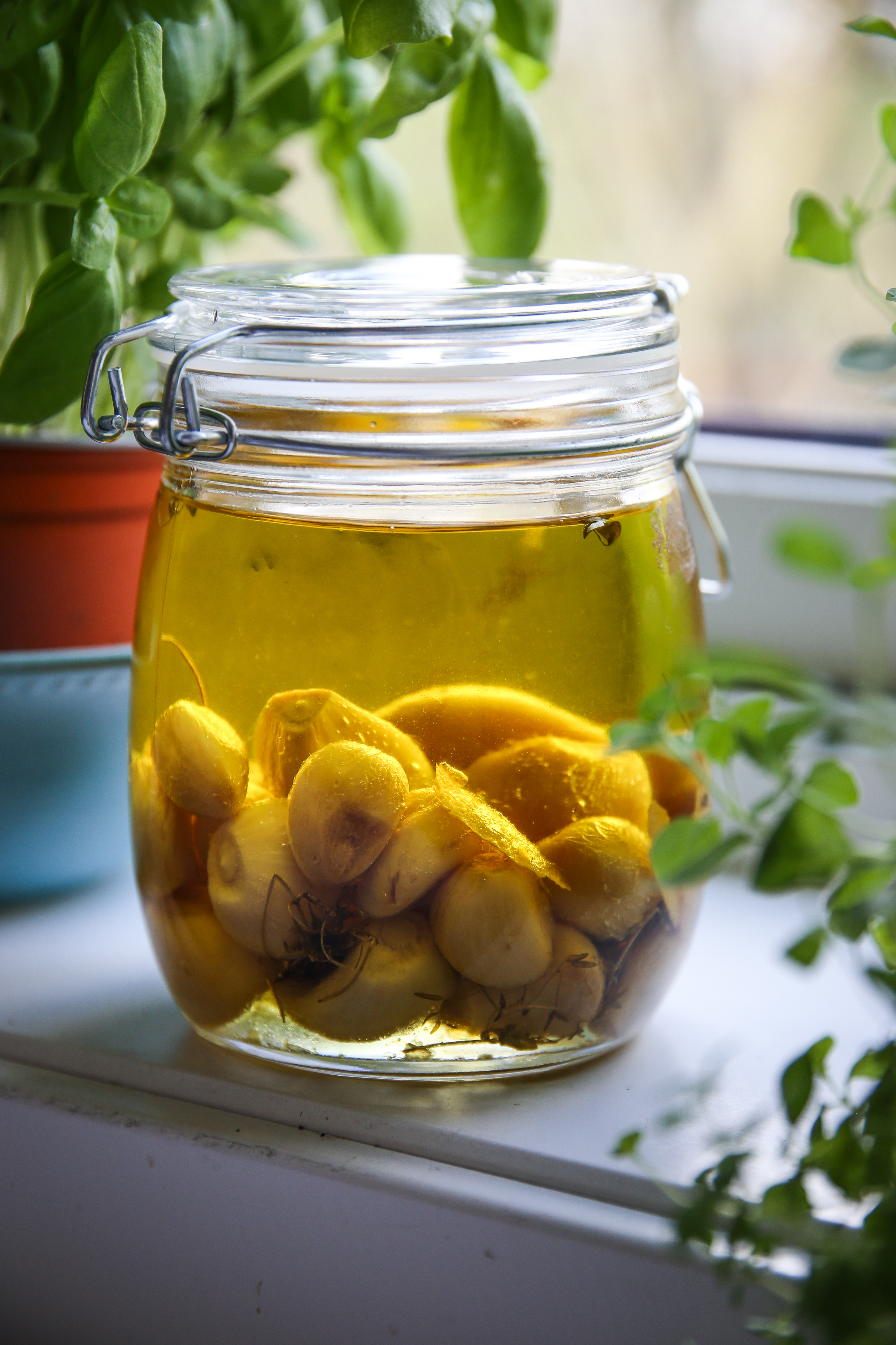 Man kan alltid ha et glass med confitert hvitløk stående i kjøleskapet, på samme måte som man kanskje har et glass hjemmesyltet rødløk, kapers, oliven. Så finnes det alltid noe godt å toppe ting med, for eksempel sandwicher og smørbrød, salater, fisk- og kjøttstykker eller de grillede grønnsakene som vil dukke opp nå utover våren og sommeren. Oljen er også helt sublim etter å ha blitt infusert med hvitløk over to timer på lav varme i ovnen. Hvitløksmaken er ikke påtrengende og vil på ingen måte dominere smaksbildet med mindre du dynker maten i den.