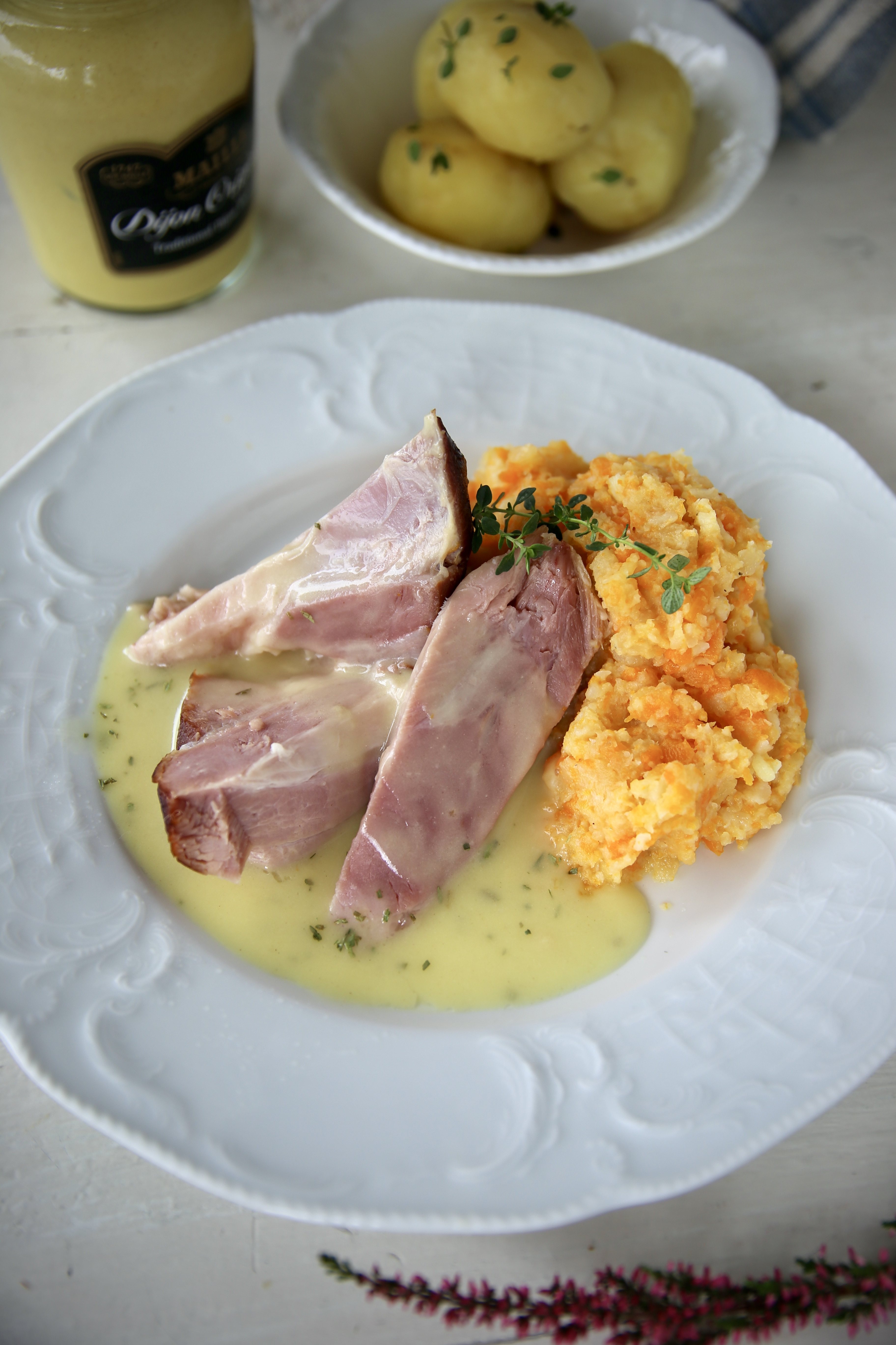 Lag rotmos mens svineknoken koker. Den kan varmes igjen før servering.